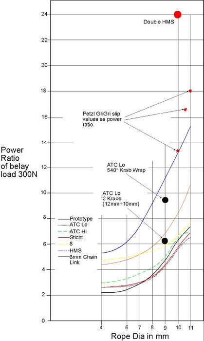 Some studies such as Ratzenburger give the results as the braking force in kN for a given `hand´force in N but others, including myself prefer to divide the former by the latter to give the power ratio as this seems easier to visualise. It is important to note that this ratio will vary depending on the load so one should always specify the `hand´force in the results. The results are of course specific to the ropes one has chosen to use, soft or hard, dry treated or not but this is inevitable until a "standard test rope" is developed. For published results the make, diameter and treatment of the rope used should be given to allow some comparison to be made.