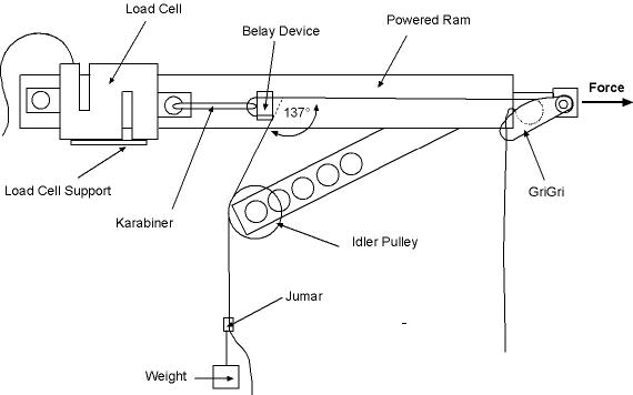 The system used by Black Diamond and in a modified form by myself is far more suitable for development work as test cycles are enormously faster and rope consumption much lower, the capital costs and space requirements are also a fraction of those of a drop tower. The results are as accurate as a drop tower but the slippage resulting from a defined fall has to be calculated rather than read directly, though of course with the drop tower this also has to be calculated for any other