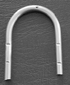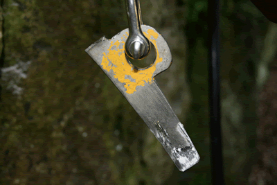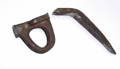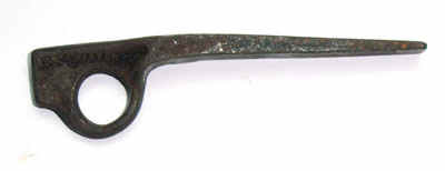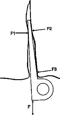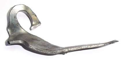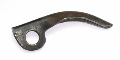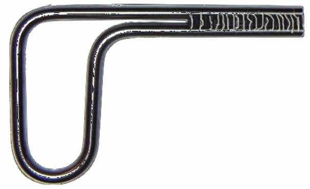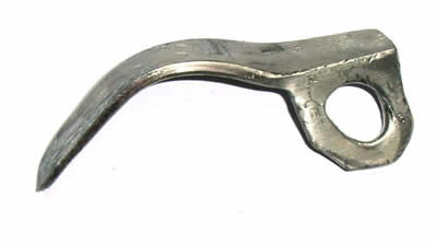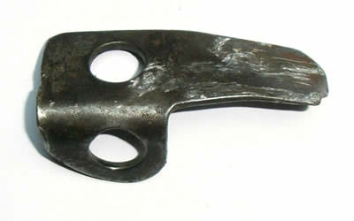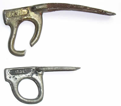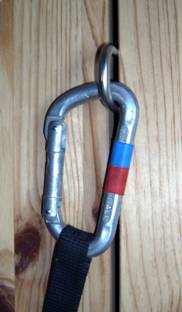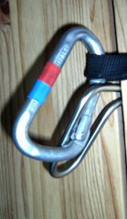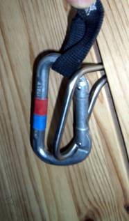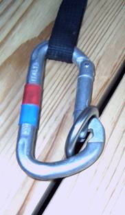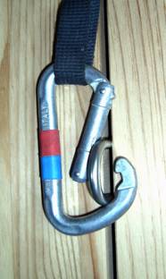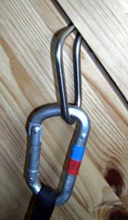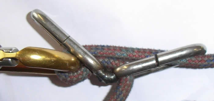 Another way is to arrange the plate so that the loaded rope forces the dead rope onto the device body, this is the principle of the `guide plate´. Not many devices have been made with this principle for lead belaying though the Kong Robot could be used this way. I saw a device using this principle on my first Alpine trip in 1970 which was made from one short chain link welded at an angle to a long one, it appeared home-made but most things were then anyway. Out of curiosity I have made a couple up and played with the angles, around 135° seemed best and and also with two long links instead of one short and one long, while it gave good braking power the rope handling was not really acceptable requiring more delicacy than is usual for climbers. Paying out is relatively good but if you need to take in slack the device rides up into the locking position easily. Here´s a picture for you home experimenters. One way to improve the handling might be to add a spring on the karabiner side as on some older Sticht plates, but I think marketing this weird monster with a spring on the back would be difficult to say the least! (Don´t worry about the cuts through the