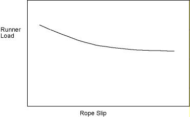 As with many things, belay device performance is a compromise, a harder braking device stops the climber sooner but loads the system more, a softer one increases the risk of belayer failure.. The limits to this compromise are clearly the ability of any part of the system to withstand the forces applied (i.e.a runner) and the amount of slip through the belayers hand which at a certain point will cause injury and loss of control. To limit the forces on the equipment a more dynamic style of belaying is desirable but the effect is very much a diminishing one as the climber falls further, effectively increasing the fall factor as one can see from this curve of runner load against rope slip derived from various drop tests. The graph is dimensionless in this case but for a normal runner load of 5kN the rope slip is ca ¼ of the fall length after which the cushioning effect has become negligable. Naturally letting the climber fall further may also be a very bad idea!