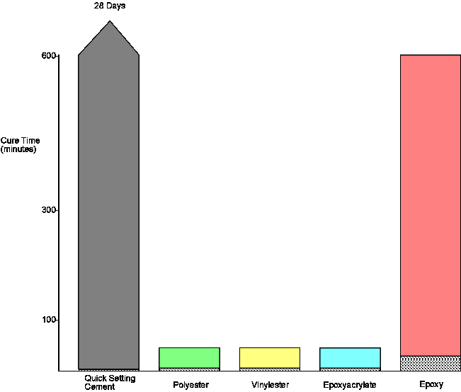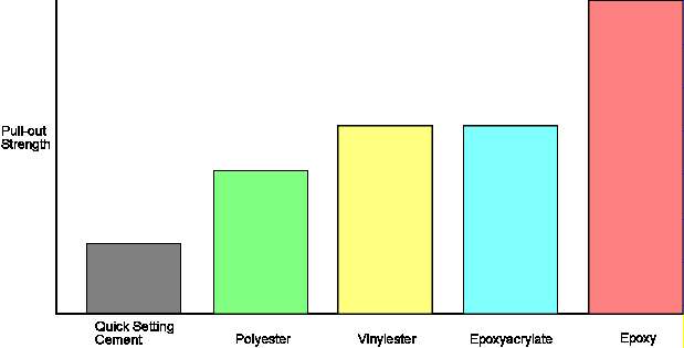Below is a photograph of a test series using various cleaning methods in a concrete block, identical bolts glued in with polyester and axially tested;
