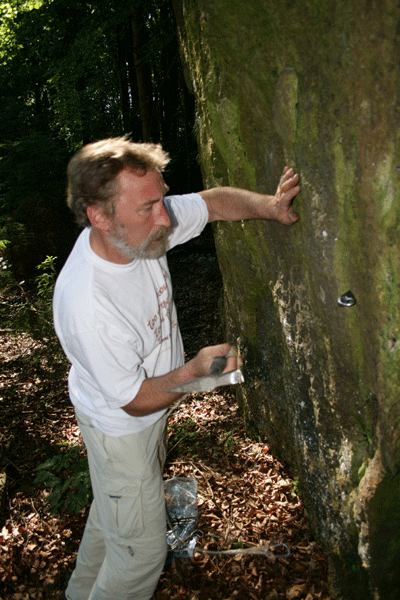 Using all your normal trad rack and a couple of hooks aid up placing protection bolts as you go and of course clipping them. If the route is of any decent standard you will probably run out of gear placements somewhere, you can use shallow drilled holes and bathook, small bolt-ins, removable bolts or, as I prefer, studs or rivets. The pattern we have developed and sell uses a 6mm hole 25 or 30mm deep and can be easily removed and re-used, they hold surprisingly well (600kg+) and I have fallen on them when hook placements above have failed.