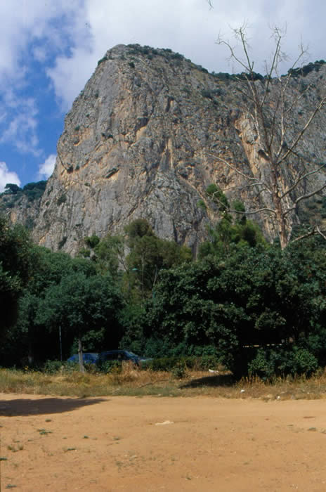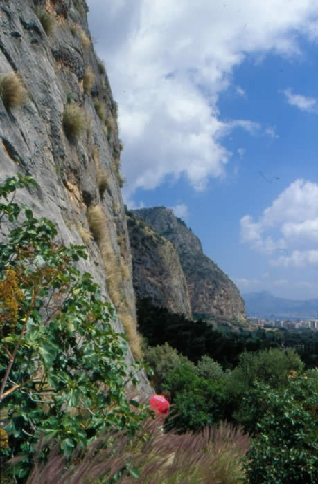 A poor photo of climbing at Palermo with the city behind, around 200 sport routes, some multi pitch with near-endless potential on the best inner city-crag in the world. (Not Avon Gorge, Bristol as Chris Bonington would like us to believe.)