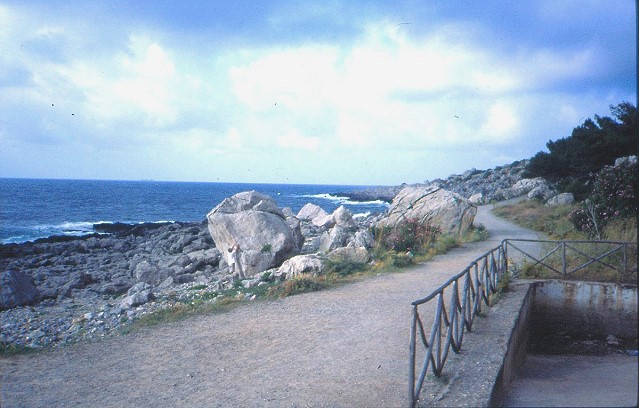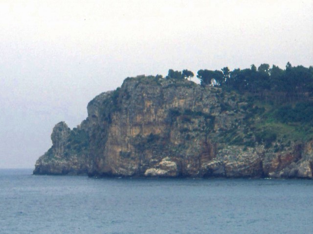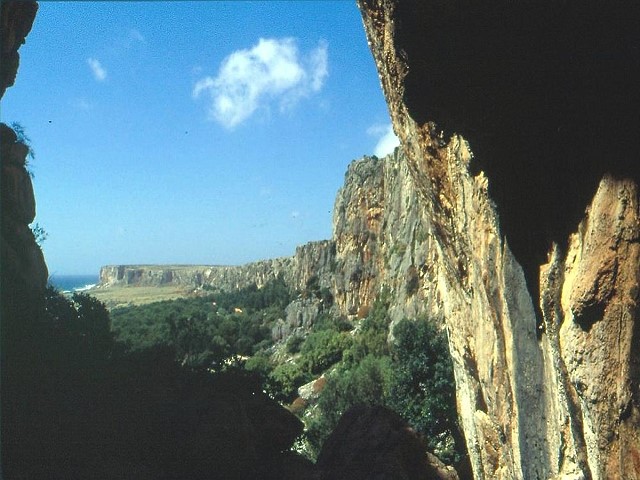 Our main objective, part of the four kilometre of untouched cliff by San Vito, one of the best sport cliffs I have ever seen with super access, between 15 and 30m high, the greener area in the centre is a four star campsite.
