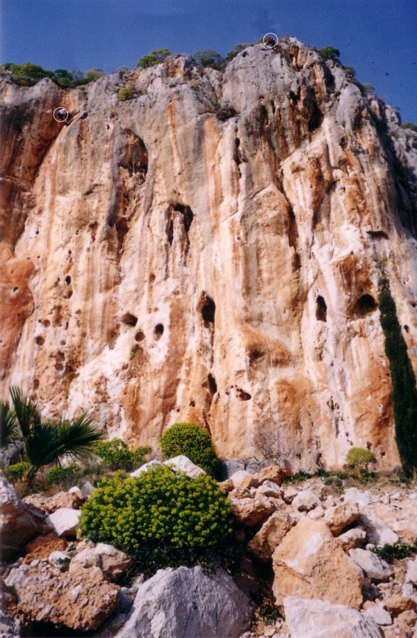 Photo: Central section of Neraki with Aris and Myself at work! Height. 40m. Altitude. 0m. Routes. 29. Season. Winter. access. Excellent. Walk-in. 15min. Water. No. Beach. Yes. Children. Good. The main cliff of the Naplion area and a superb venue, a steep overhanging orange cliff with many holes and caves lying halfway between Naplion and Karathona Bay. A nice little bay and beach to swim after climbing. Ape, Chimp and Orangutan by J. Titt, the rest by A. Theodoropoulos and local climbers especially Thanos Sotiropoulos. S facing so very hot in the summer months but an excellent winter cliff. Note. The numbers on the photo do not correspond with the route numbers, for orientation you should know that route 14, Orangutan is numbered 22 on the topo, route 15, Rosso is numbered 24. (This is due to giving seperate numbers to the extension uppr pitches). I will try to improve these photos sometime.
