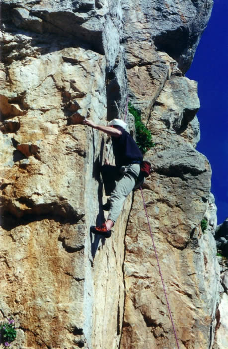 Photo;Tim Dunsby on The Leading Edge, Kastro Thermisia. Height. 30m. Altitude. 400m. Routes. 23. Season. Not Summer. Access. Excellent. Walk-in. 5min Water. None. Children. Dangerous for little ones. A looming red cliff above the coast road, bulging and holdless with huge roofs at the base, luckily the routes are on an upper tier and are more human. The remains of a Venetian castle cover the top of the crag and provide an interesting ramble while the routes below give more of a challenge. The three reasons to come here are the view over the coast and islands, the cliff is a sun trap and ideal if it is cold elsewhere and finally the route New Order, mega! 9 sport routes between 5b and 6c+ and some top-roped easier stuff. The Routes Worth the trip just for this one route, in contrast to the rest which tend to be very technical this one climbs up an impossibly steep wall at only 6a. New Order, go for it!
